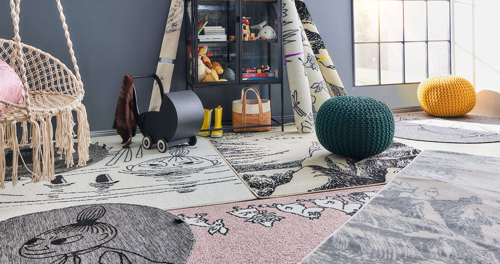 Harmaapohjaisissa matoissa seikkailevat sympaattinen Muumipeikko, ilkikurinen Pikku Myy sekä ärhäkkä Haisuli. Matot antavat leikkeihin hyvän pohjan, sillä niiden liukuestepohjaus pitävät ne paikoillaan hurjemmissakin seikkailuissa. Pölyämättömät matot ovat kestäviä ja helppohoitoisia, eivätkä ne ole moksiskaan villimmästäkään menosta. Kun vielä suojaat matot Softcare Mattosuojalla, lähtevät leikin tiimellyksessä ilmestyneet tahrat helpommin pois. Mustavalkoisissa malleissa on kuvituksia suosikkitarinoista. Vekkuleissa Rannalla-matoissa Pikku Myy kelluu lumpeiden keskellä ikään kuin leikkiin kutsuen. Taikurinhattu-tarinan otteessa on syytä olla hiukan varuillaan, ettei leikki käy liian jännittäväksi pienimmille. Tutkimusmatka-matossa on jo melkoinen meno, kun koko Muumilaakson väki marssii veikeästi ympäri maton reunaa. Mattojen koot 133 x 190 tai pyöreä halkaisijaltaan 130 cm.