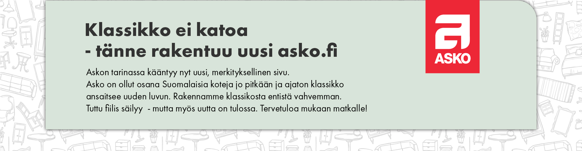 Asko on sisustanut suomalaisia koteja jo yli 100 vuotta. Pitkän historian perustana on aina ollut asiakaslähtöisyys sekä laadukkaan malliston jatkuva kehittäminen. Askon verkkokaupasta löydät laajan valikoiman klassikkoja, designhuonekaluja sekä viimeisimpien sisustustyylien mukaisia sisustustuotteita helposti kellon ympäri! Asko-myymälöissä Sinua palvelevat huonekalu- ja sisustusalan ammattilaiset. Lisäksi myymälöistä löydät sisustussuunnittelijoiden luomia inspiroivia ja ajanhenkisiä sisustusmiljöitä. Tervetuloa poimimaan parhaat sisustusideat Sinun kotiisi.