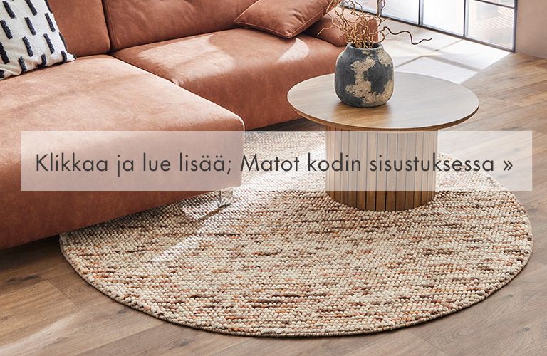 Oikean kokoinen matto ei ole liian suuri, eikä liian pieni. Se kasaa kalusteet yhteen, rajaa tilaa, sekä näyttää sopusuhtaiselta huoneen kokoon nähden. Maton keskilattiakoko on yleensä 160x230 cm, mikä saattaa olla monen suuren sohvan edessä jopa pieni, joten mittaa tila huolella ennen kuin lähdet matto-ostoksille. Joskus toimivin valinta on pyöreä matto. Silloin ei tarvitse miettiä maton mittasuhteita tai haasteellisen mallisen huoneen kulmia. Nyrkkisääntönä olohuoneen maton asettelussa on, että maton pitäisi yltää kokonaan sohvan alle ja jäädä esille sohvan molemmin puolin. Lisäksi matolle pitäisi mahtua sohvapöytä. Suuret keskilattiamatot ovat kooltaan n. 200x300 cm. Mikään ei myöskään estä laittamasta kahta samanlaista pienempää mattoa rinnakkain, jos näin löytyy olohuoneen matolle optimaalisin koko.