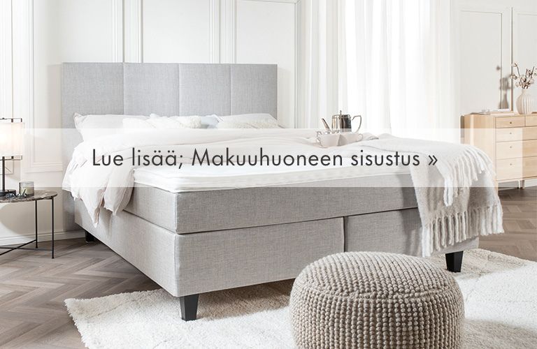 Makuuhuoneeseen lempeän ja rauhallisen tunnelman luo vaalea ja neutraali väripaletti. Suosi sängyn petauksessa pellavalakanoita ja sängynvieressä villamattoja. Vaaleat valoverhot päästävät auringonvalon sisään, mutta blokkaavat näkymän sisätiloihin. Valaisimissa kauniin ja pehmeän valon tuo värilämpötilaltaan 2700–3000 Kelviniä olevat polttimot. Lampun valoa voi vielä pehmentää sopivalla lampunvarjostimella.