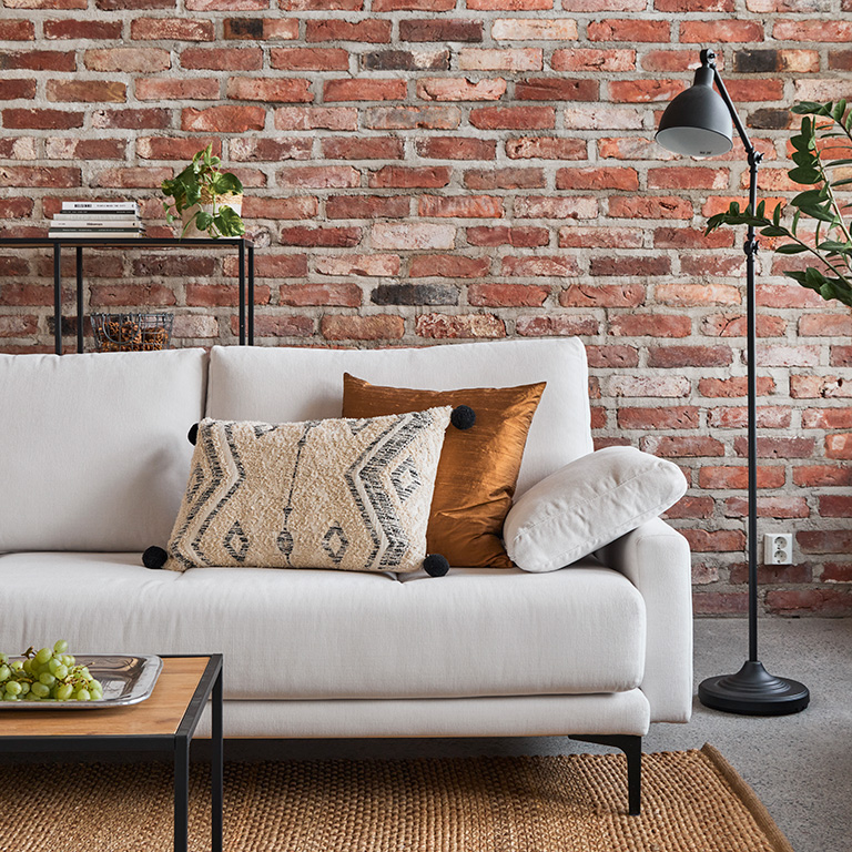 Materiaalien lisäksi avainasemassa luonnonläheisessä sisustuksessa ovat tietenkin värit. Suosi luonnon omia värejä kuten beigeä, ruskeaa, luonnonvalkoista ja hunajaa. Luonnon sävyinen, pehmeä sohva on todellinen olohuoneen katseenvangitsija. Viimeistele tunnelma luomupuuvillaisilla koristetyynyillä, houkuttelevalla lampaantaljalla ja upeasti valoa taittavalla rottinkivalaisimella. Tyyliin sopivaa vehreyttä saat viherkasveista ja koristekukista.