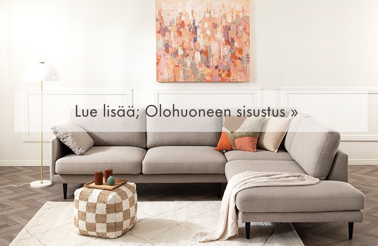 Valitse olohuoneeseen sohva, joka on kuin pehmeä ja upottava syli. Valitse sohvan verhoilukankaaksi pellavasekoite tai puuvillasametti ja lisää päälle aito lampaantalja ja kasa koristetyynyjä. Lisää olohuoneen senkin päälle viherkasveja ja sohvapöydälle keramiikkavaasissa kuivattuja heiniä ja oksia.