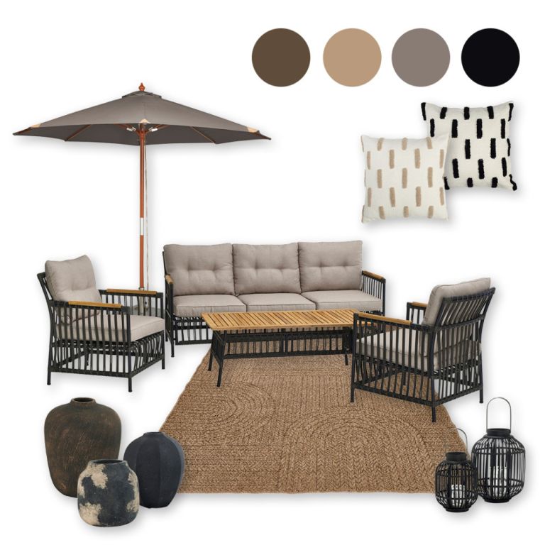 - Japandi ammentaa värinsä luonnosta. Suosi puutarhakalusteissa luonnonvärejä, kuten ruskeaa, beigeä tai harmaata. Musta väri antaa Japandi sisustuksessa kokonaisuudelle raamit, joten sitä voi aina lisätä mukaan sopivina annoksina yksityiskohdissa.