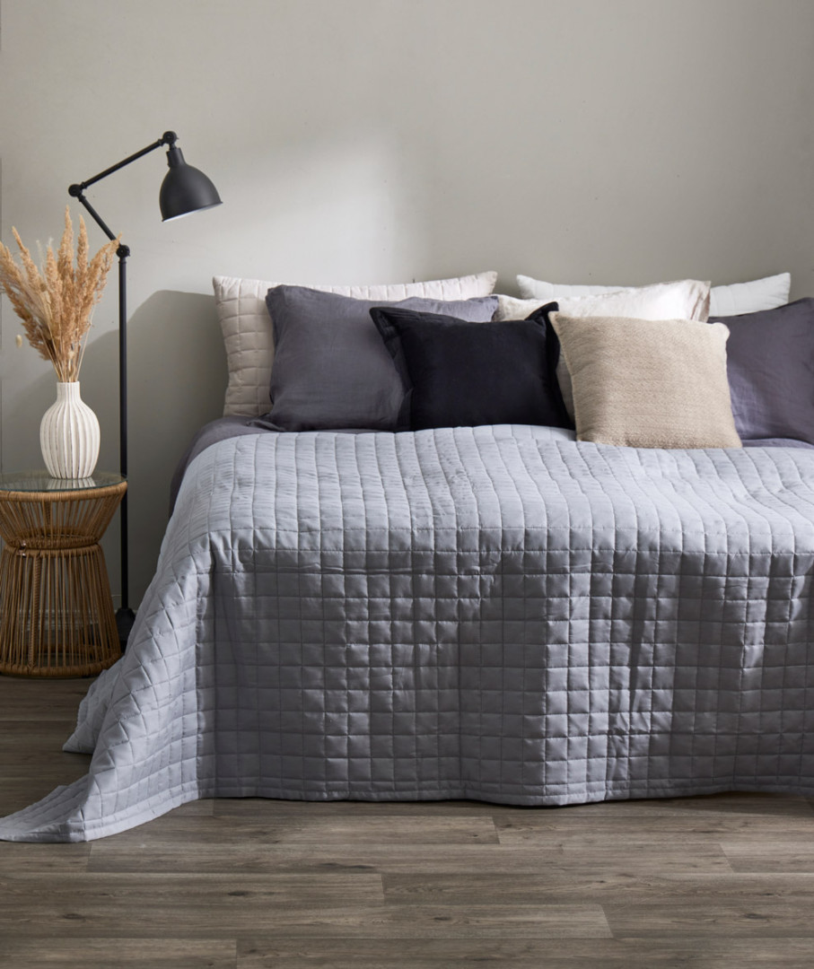 HETKI-päiväpeitto on yksivärinen ja siinä on ajaton ruututikkaus. Päiväpeittoon on helppo yhdistellä värikkäitä tyynyjä. Päiväpeite on molemmilta puolilta samanlainen, joten sitä voi käyttää molemmin puolin.