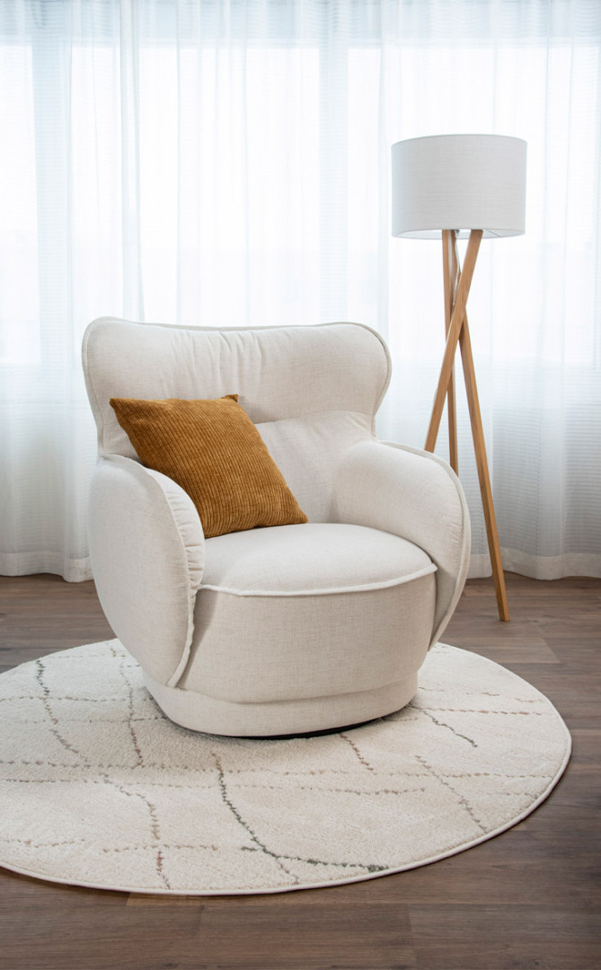 Vaalea mattasävy yhdistettynä eritasoiseen vaaleita värejä sisältävään kuvioon tuo hillityn modernia elävyyttä olohuoneeseen tai muuhun kodin tilaan. Matalanukkaisena se on helppohoitoinen ja sähköistymätön.