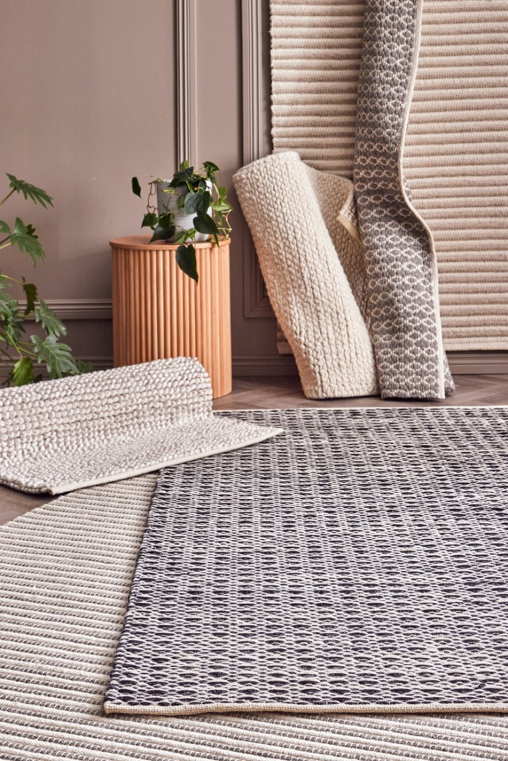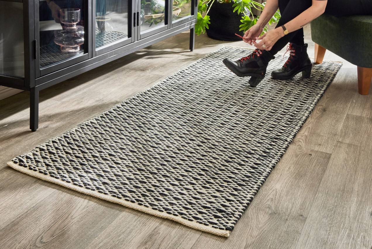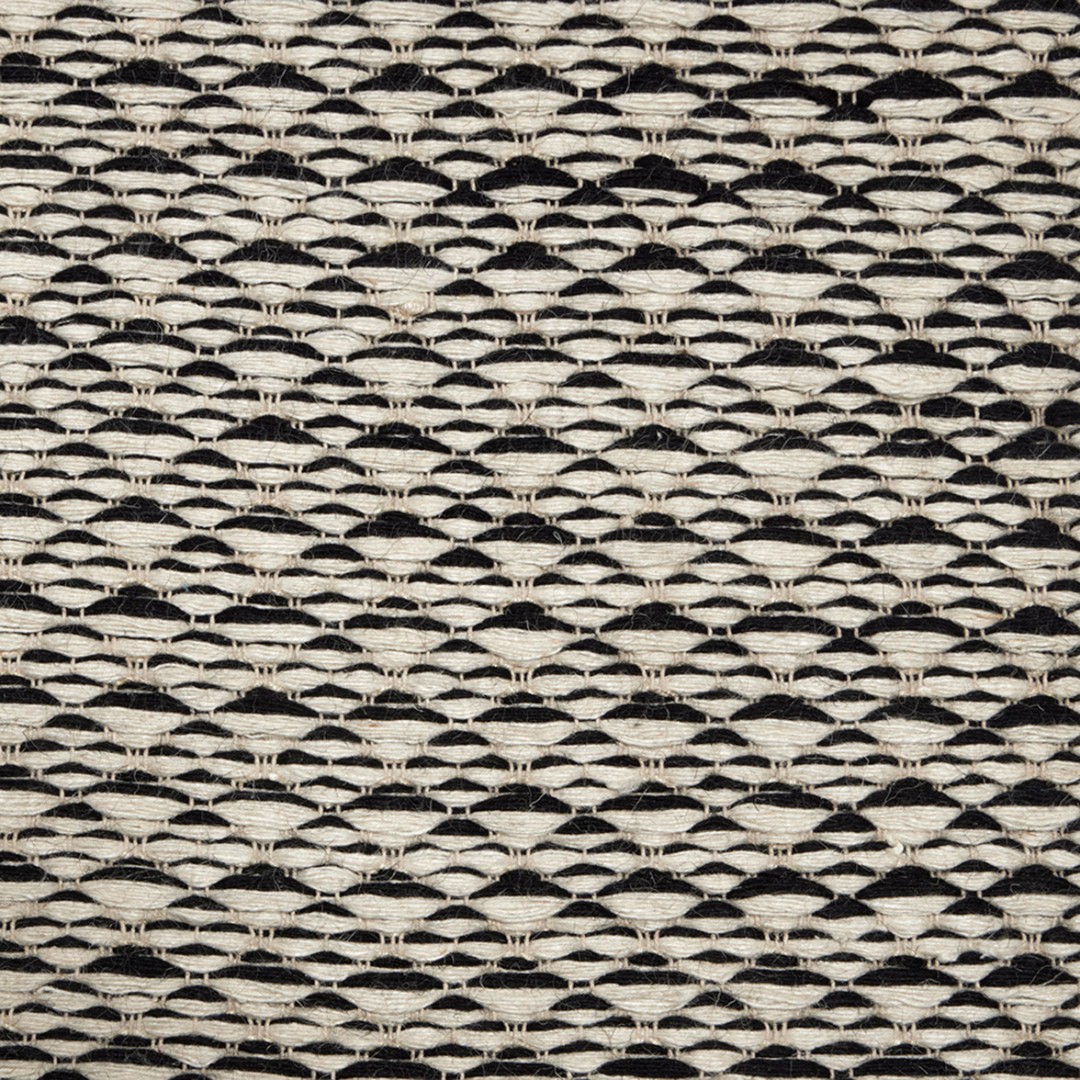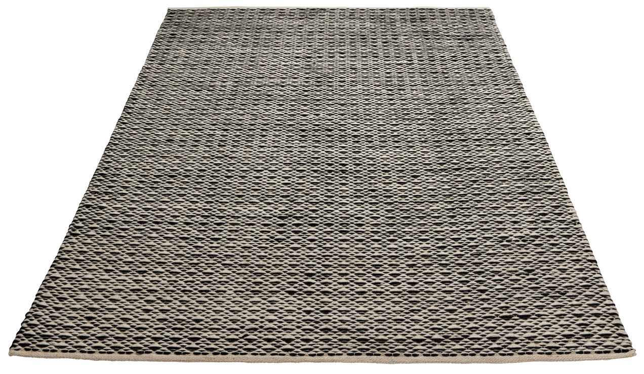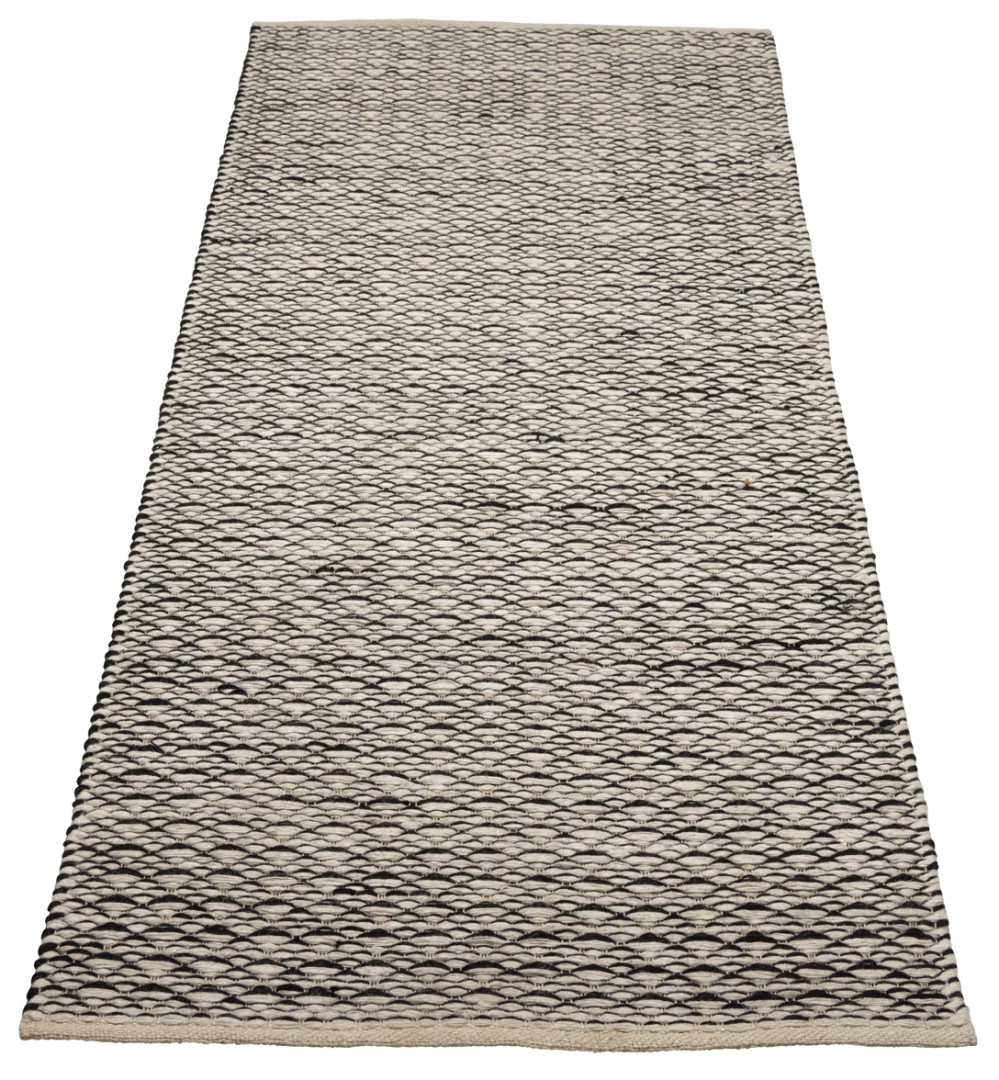 Musta-valkoinen Koivu-matto on valmistettu kierrätysvillasta ja valkaistusta juutista.