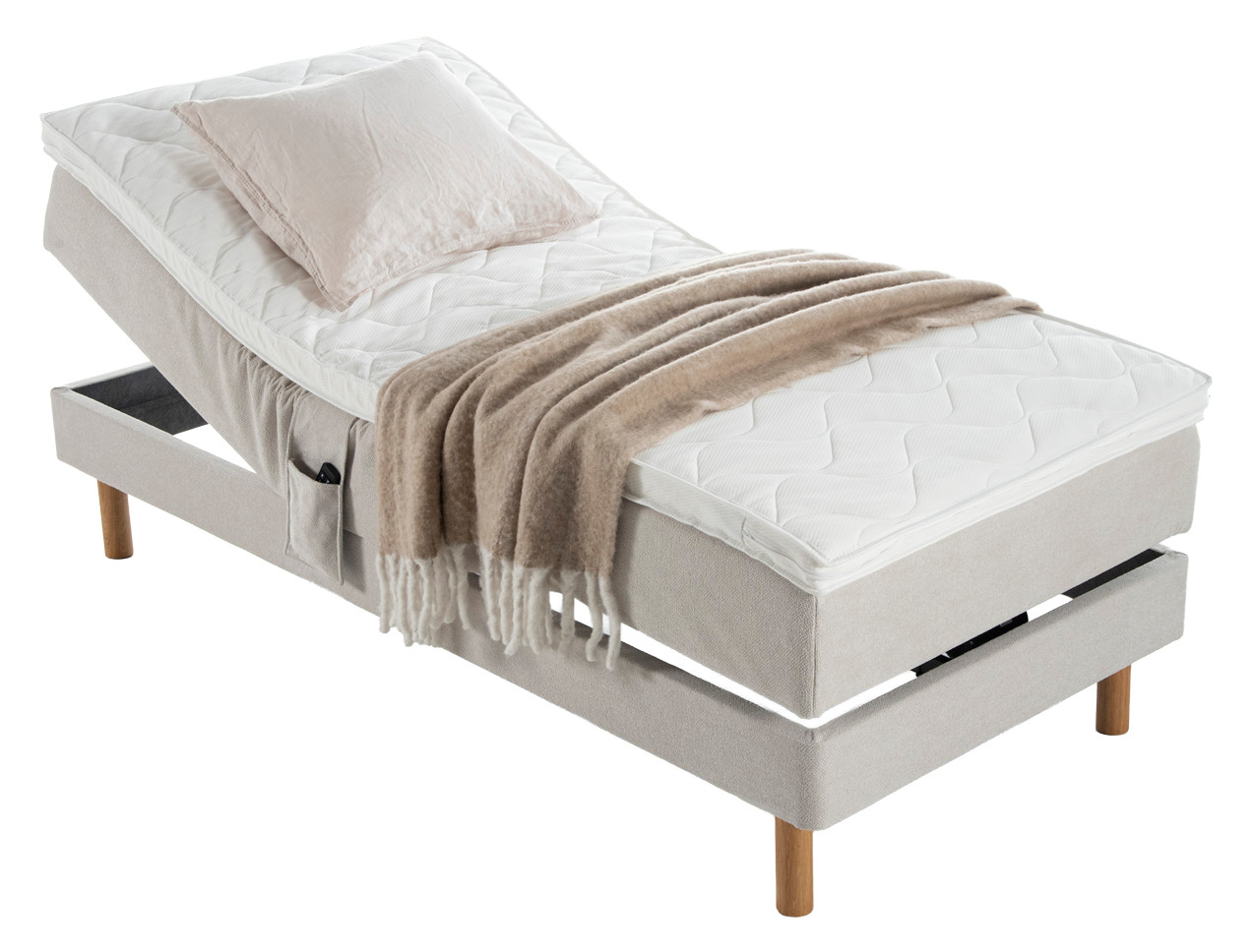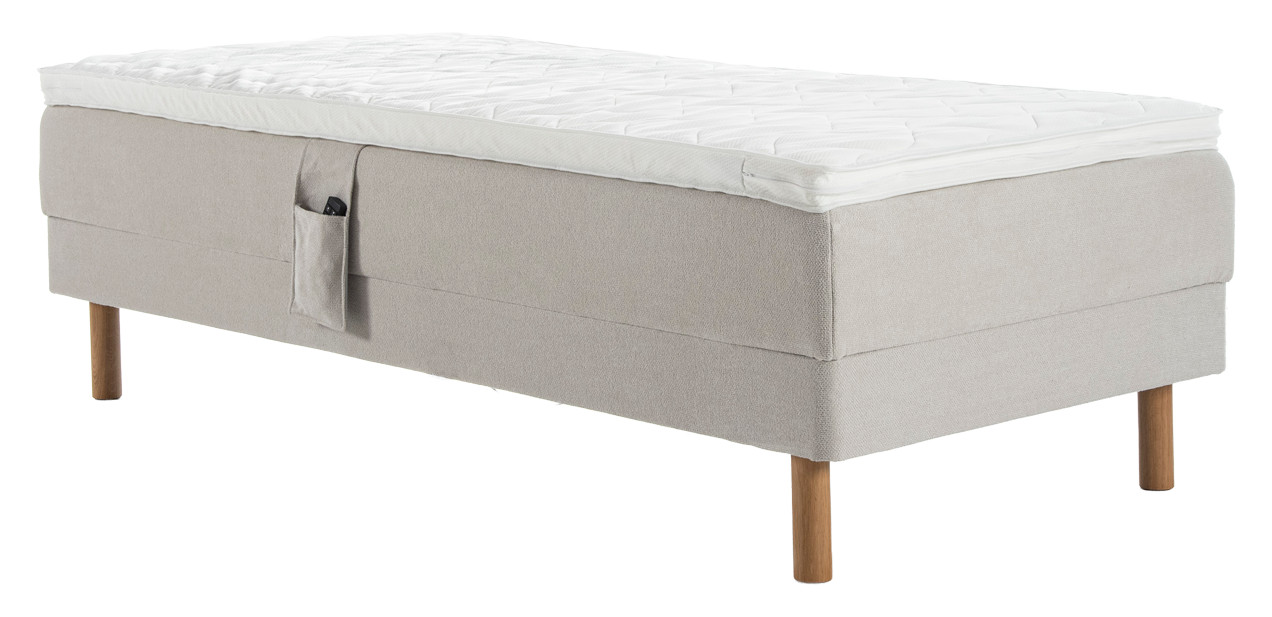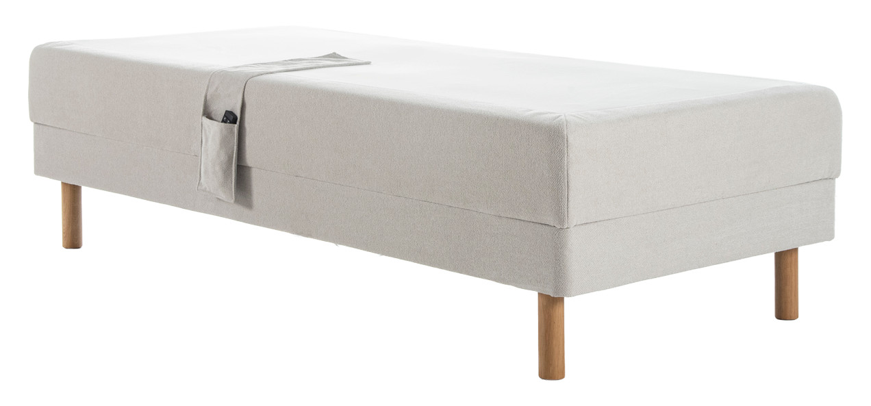 Vaalea kangasverhoilu ja tammen värinen jalkasarja viimeistelevät USVA-moottorisängyn tyylikkään ja raikkaan ilmeen, joka tuo makuuhuoneeseen luonnollista harmoniaa ja rauhaa.