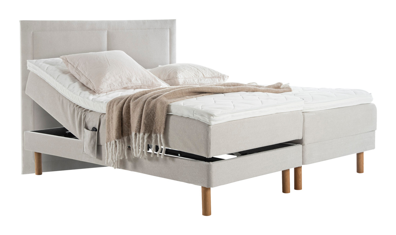 Vaalea kangasverhoilu ja tammen värinen jalkasarja viimeistelevät USVA-moottorisängyn tyylikkään ja raikkaan ilmeen, joka tuo makuuhuoneeseen luonnollista harmoniaa ja rauhaa.