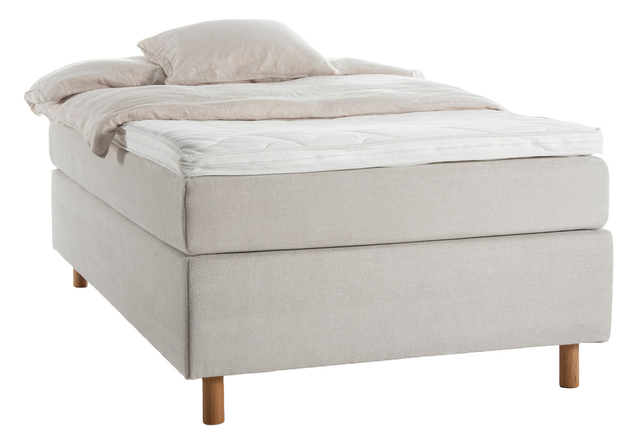 USVA-patjan pintakankaana toimii laadukas joustokangas, joka lisää nukkumismukavuutta myötäilevyydellään. Tämä tarkoittaa sitä, että patja mukautuu kehosi muotoihin entistä paremmin, jolloin tunnet olosi kevyeksi ja täysin rentoutuneeksi yön aikana. USVA-jenkkisänky on verhoiltu tyylikkäällä beigen värisellä huonekalukankaalla, joka tuo makuuhuoneeseen luonnollista lämpöä ja ajatonta eleganssia. Beigen sävy on helppo yhdistää erilaisiin sisustustyyleihin, ja sen neutraali värimaailma pysyy aina ajankohtaisena. Sängyn viimeistelee tammen värinen kartio-mallinen puujalka, joka antaa sängylle kevyen ja ilmavan sekä esteettisesti kauniin ilmeen.