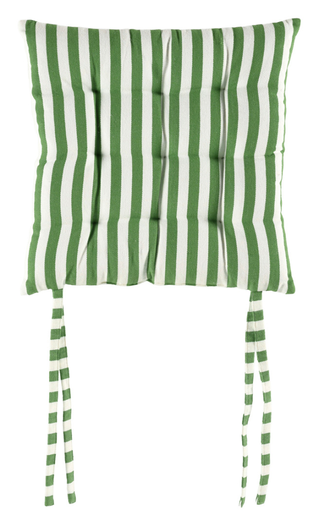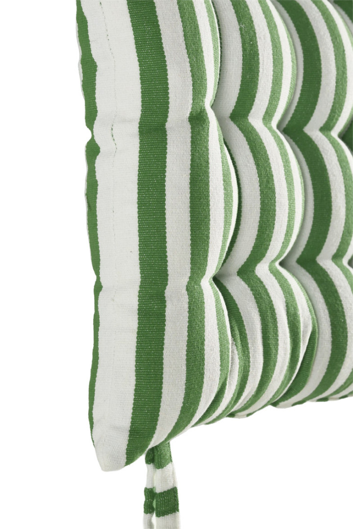 Vihreä-valkoraidallinen BELA-istuintyyny on pehmeä istuintyyny lisäämään istuinmukavuutta, erityisesti kovalla pinnalla istuttaessa. Raidat tuovat väriä ja visuaalista rytmiä sisustukseen.
