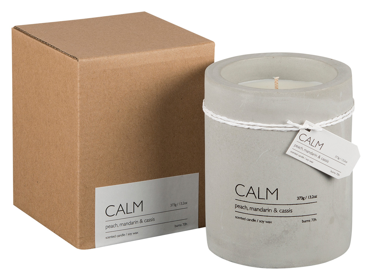 CALM-tuoksukynttilä on valmistettu soijavahasta, tuoksuna persikka ja mandariini.