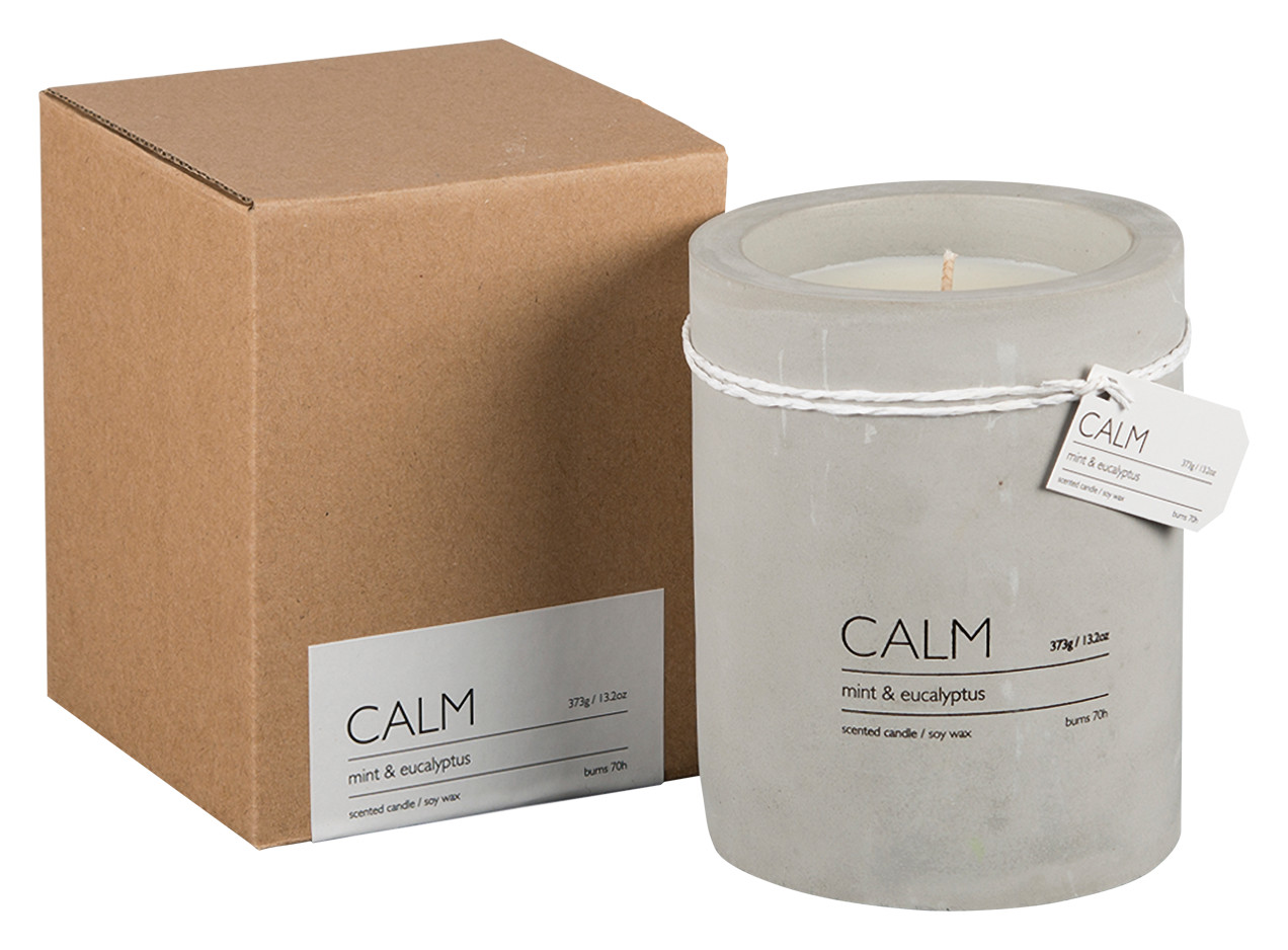 CALM-tuoksukynttilä on valmistettu soijavahasta, tuoksuna minttu ja eukayptus,