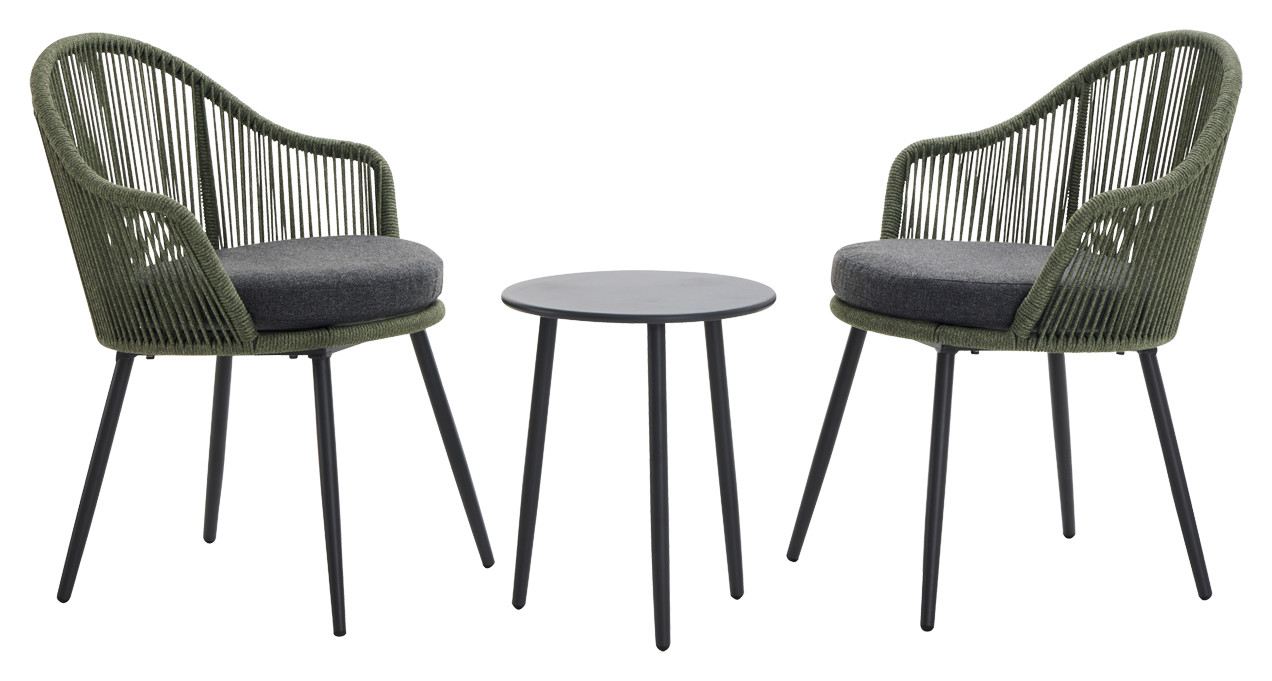 Setin laadukkaat materiaalit takaavat säänkestävyyden ja helppokäyttöisyyden. Tummanharmaa teräsrunko yhdistyy kauniisti vihreään köysipunontaan ja pehmeisiin harmaisiin pehmusteisiin, jotka ovat valmistettu säänkestävästä Spunpoly-kankaasta. Tuolit on muotoiltu ergonomisesti tarjoamaan miellyttävän istuinmukavuuden, ja niiden kompakti koko mahdollistaa niiden sovittamisen pienempäänkin tilaan.