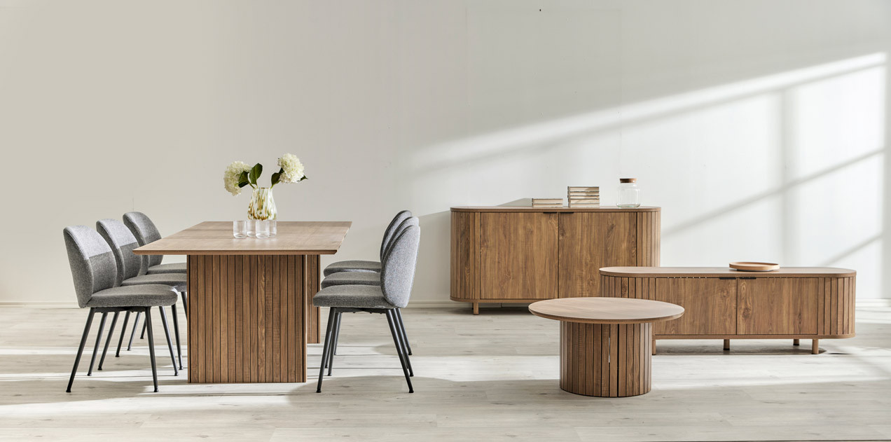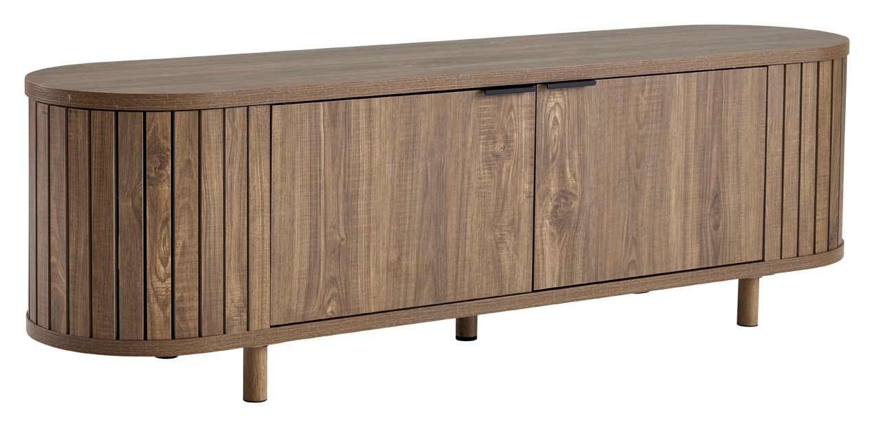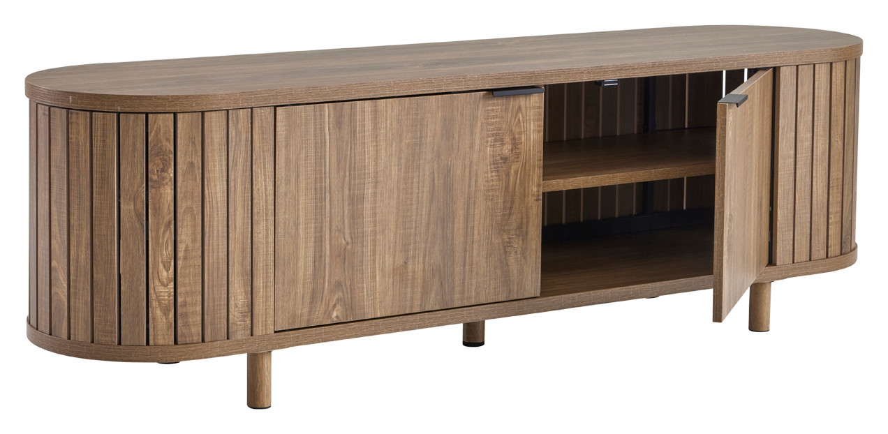 Jos pidät japandi-tyylistä, tämä COLIMA tv-taso on juuri sinulle! Sälesivuilla varustetussa tasossa on puhtaat linjat, jotka muodostavat pillerin muotoisen siluetin. Ruskea, hieman rustiikkinen sävy tasossa antaa kotiisi luonnonläheistä ja lämmintä ilmettä. Tasossa on reilusti säilytystilaa kahden oven takana. Neljälle eri tasolle saat järjestettyä tavaroita ja ne pysyvät katseilta piilossa. Jos televisiosi on kiinnitetty seinälle, voit tehdä tason päälle näyttäviä esillepanoja koriste-esineillä, maljakoilla ja kirjoilla.