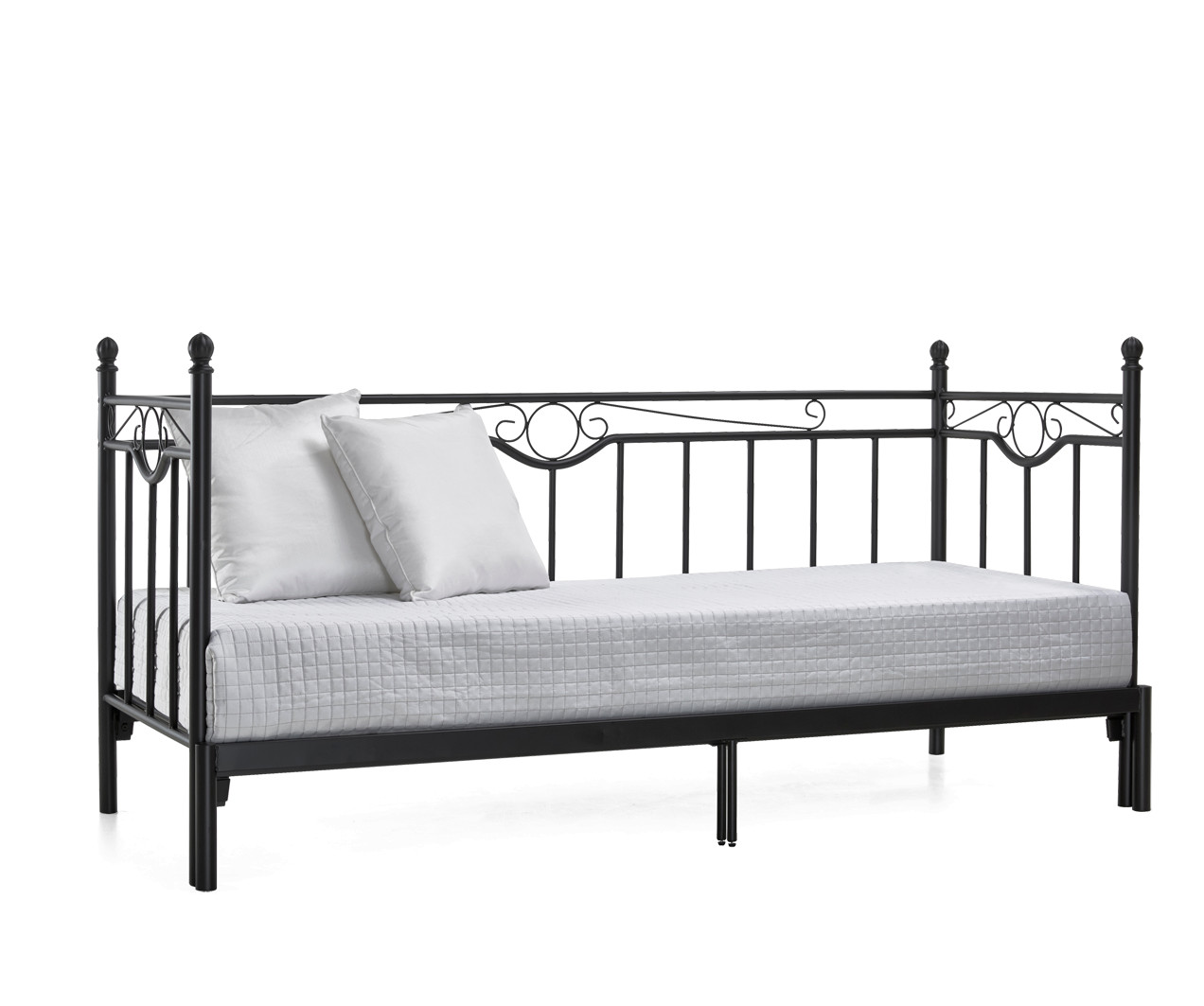 Tämä tyylikäs ja käytännöllinen sohvasänky on täydellinen valinta kompakteihin koteihin – päivällä se toimii eleganttina sohvana, ja yöllä se muuntautuu mukavaksi vuoteeksi yhdelle tai kahdelle nukkujalle. Kestävä, kauniisti kaareva metallirunko on maalattu valkoiseksi tai mustaksi, mikä tekee siitä helpon yhdistää erilaisiin sisustustyyleihin. Viimeistele kokonaisuus pehmeillä tyynyillä ja vilteillä – luo tila, joka kutsuu rentoutumaan.