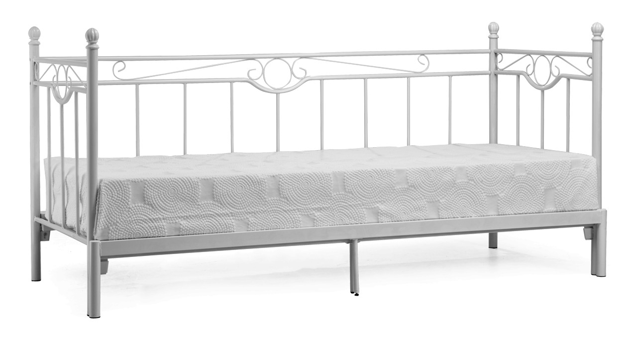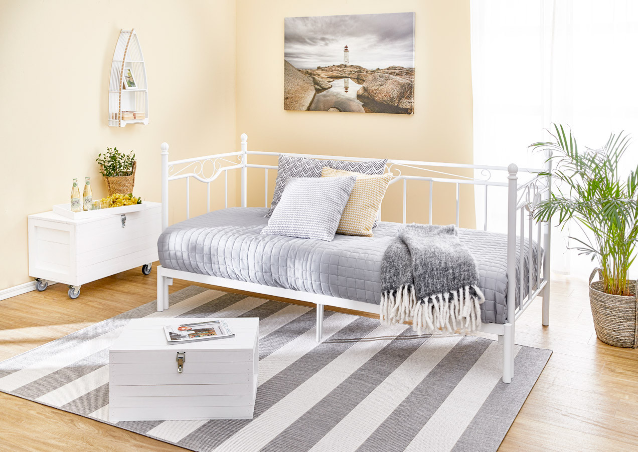 Tämä tyylikäs ja käytännöllinen sohvasänky on täydellinen valinta kompakteihin koteihin – päivällä se toimii eleganttina sohvana, ja yöllä se muuntautuu mukavaksi vuoteeksi yhdelle tai kahdelle nukkujalle. Kestävä, kauniisti kaareva metallirunko on maalattu valkoiseksi tai mustaksi, mikä tekee siitä helpon yhdistää erilaisiin sisustustyyleihin. Viimeistele kokonaisuus pehmeillä tyynyillä ja vilteillä – luo tila, joka kutsuu rentoutumaan.