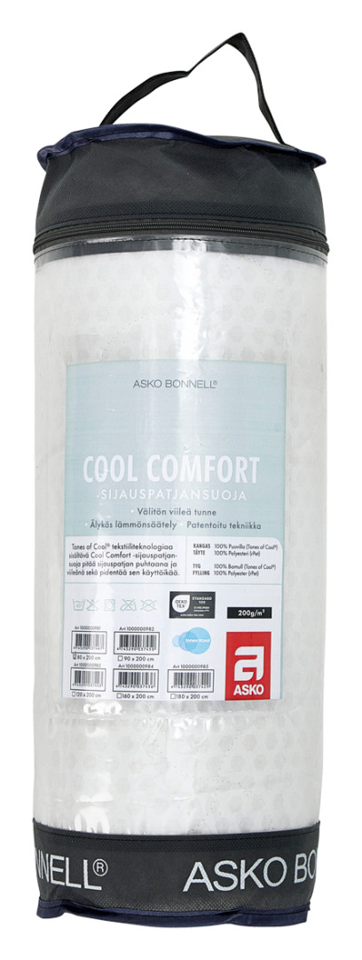 ASKO BONNELL® COOL COMFORT-sijauspatjansuojan päällinen on 100% puuvillaa ja siinä on mukana viilentävää Tones of Cool -materiaalia, joka lisää nukkumismukavuutta entisestään. Materiaali imee iholta ylimääräistä lämpöä antaen välittömän ja pitkäkestoisen viileyden tunteen. Viileä tunne vaikuttaa positiivisesti unen laatuun. Suoja estää likaa ja kosteutta imeytymästä suoraan sijauspatjaan. Se helpottaa huomattavasti puhtaanapitoa helpon käytettävyyden ansiosta ja pidentää sijauspatjan käyttöikää. Suoja pysyy hyvin sijauspatjan päällä kulmissa olevien kuminauhojen ansiosta. Pesu 40 astetta.