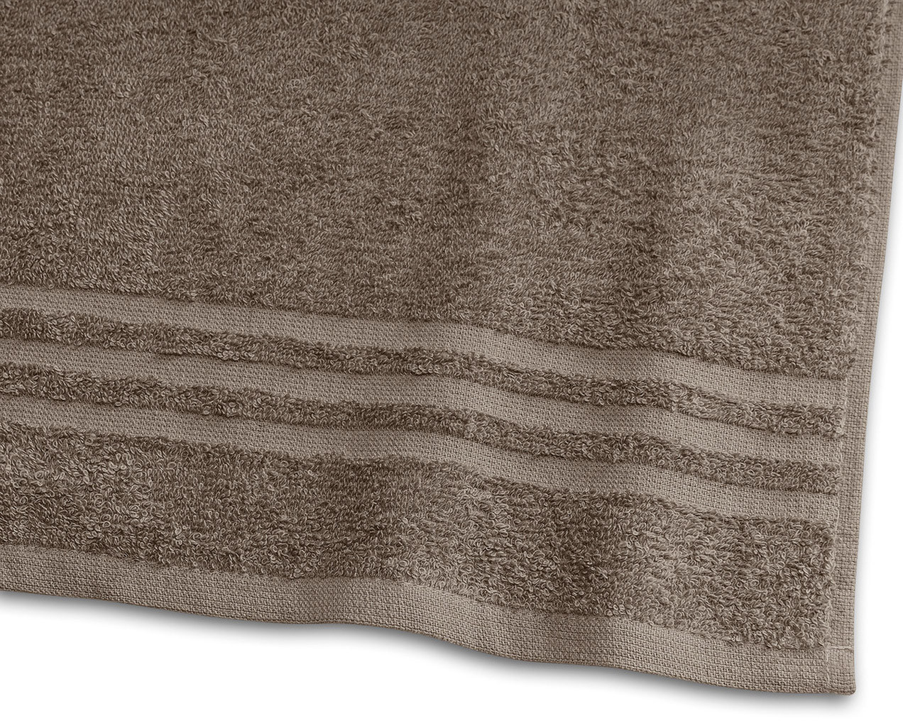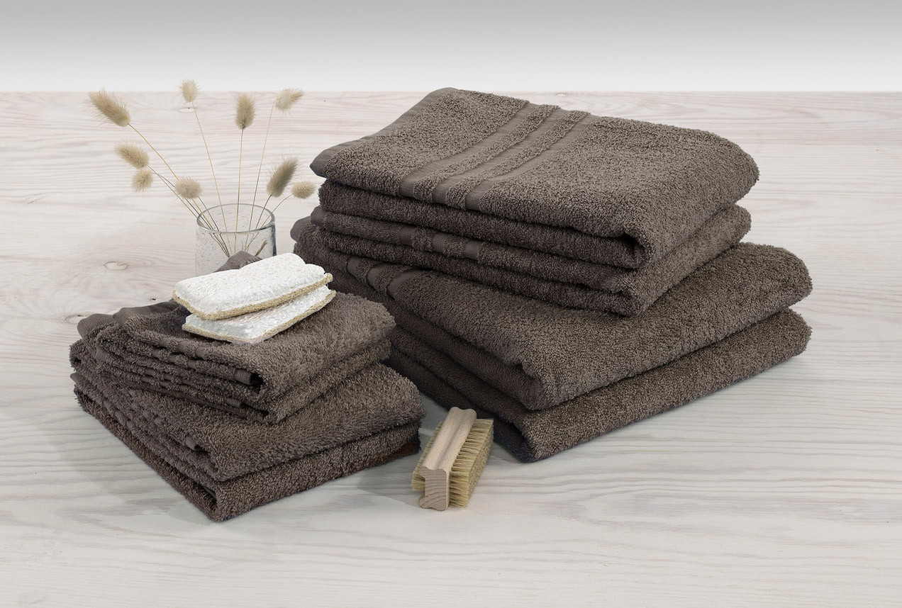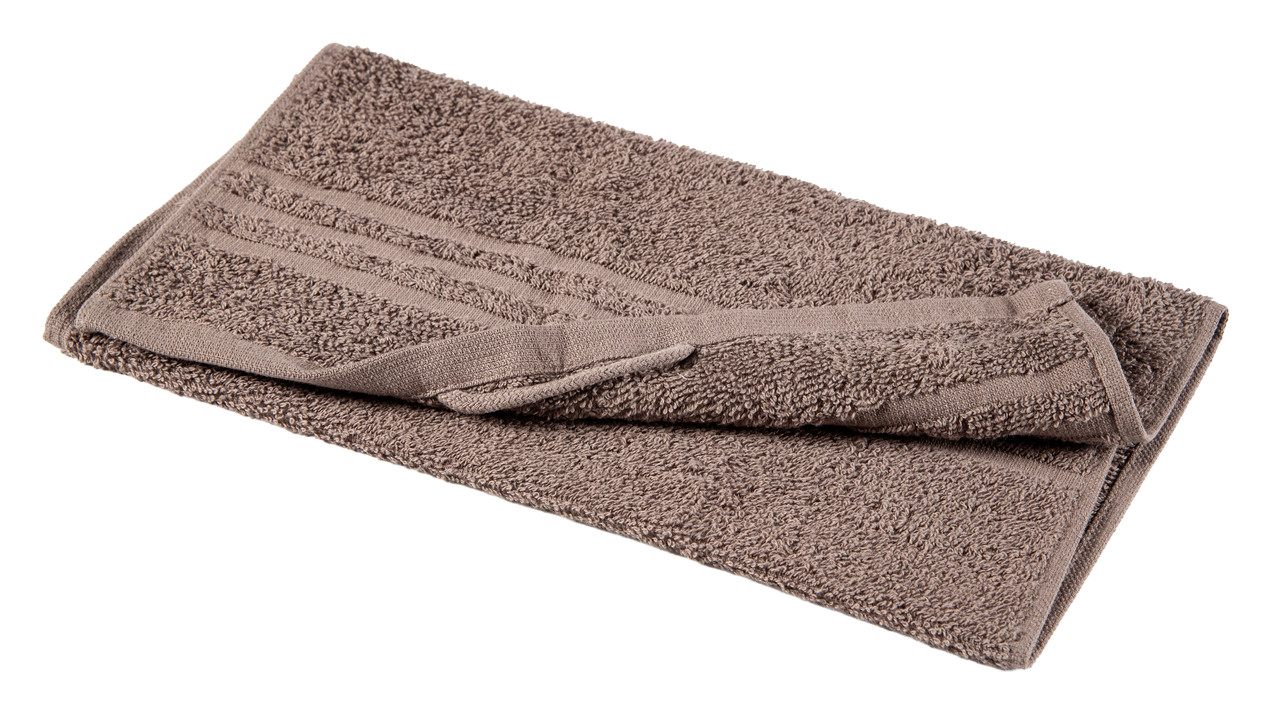 Ruskeassa Basic-froteepyyhkeessä on klassinen kuvio. Perusfroteella on hyvä imukyky.