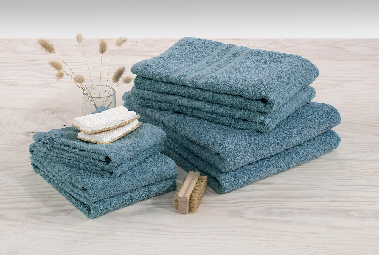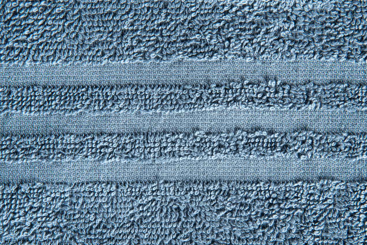Sinisessä Basic-froteepyyhkeessä on klassinen kuvio. Perusfroteella on hyvä imukyky.
