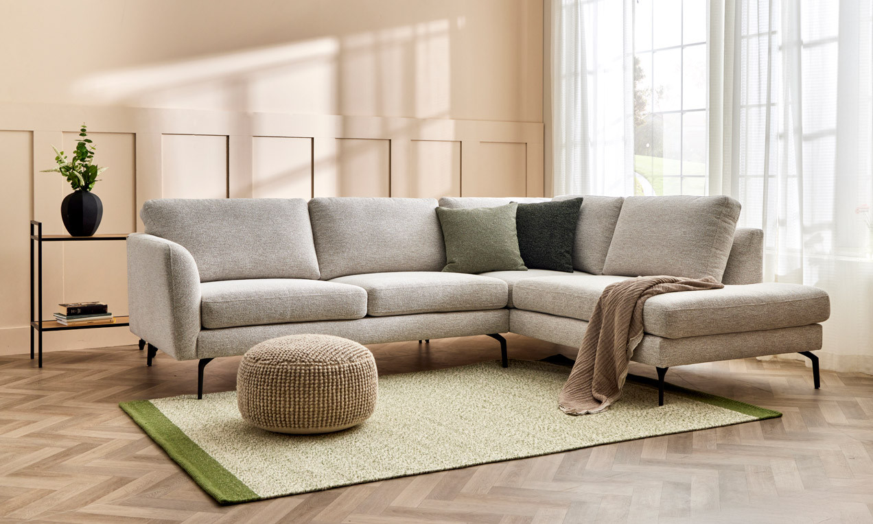 Neiser HELGE-kulmasohva avopäädyllä –Lodge-kangas ja mustat jalat