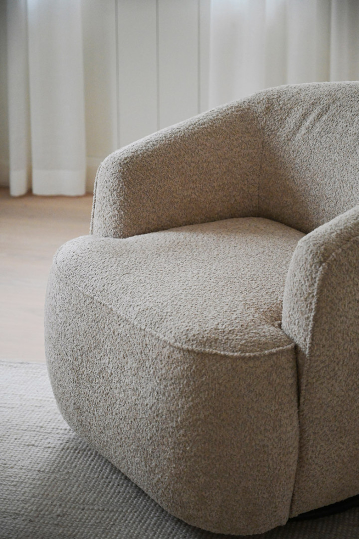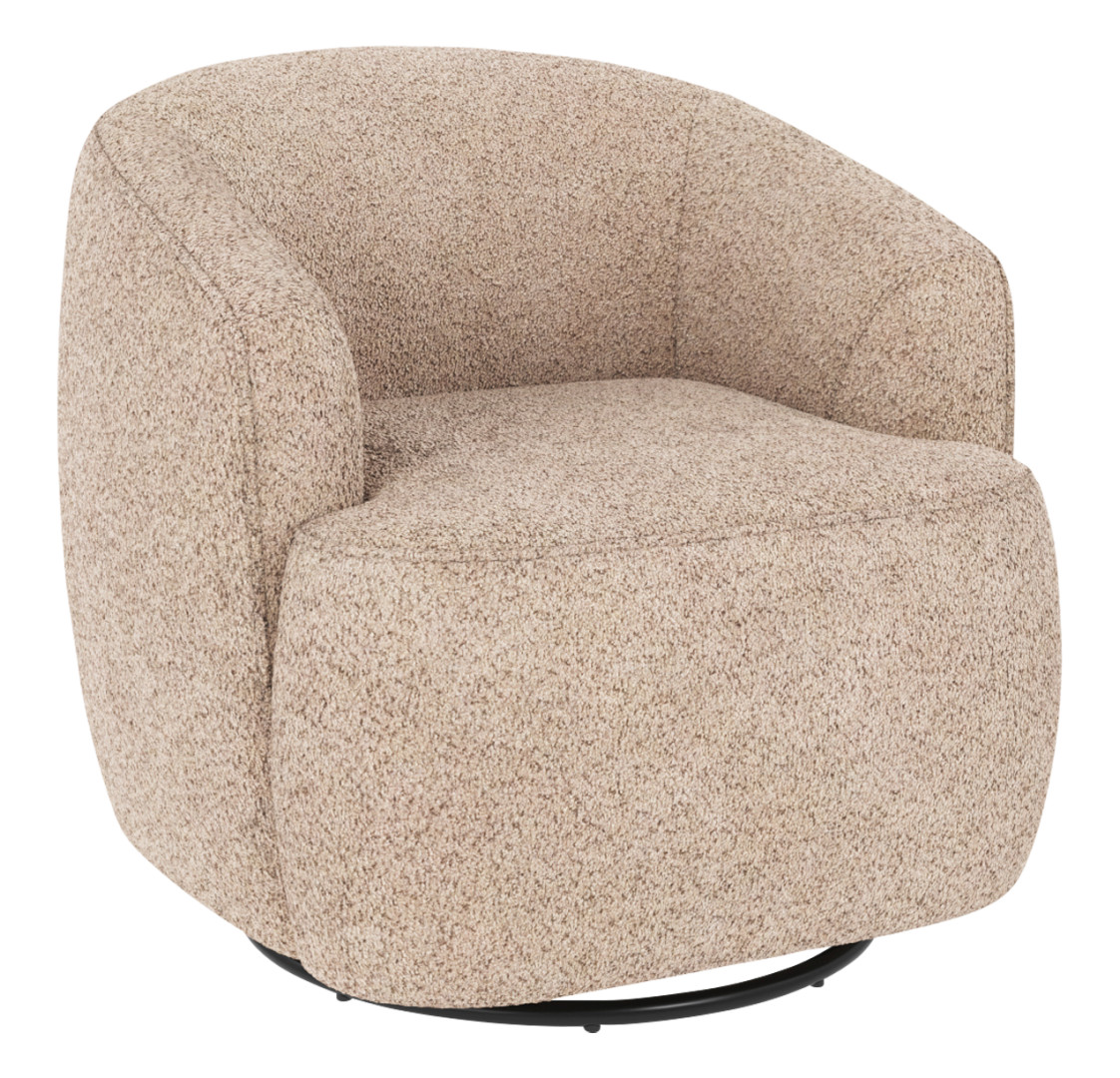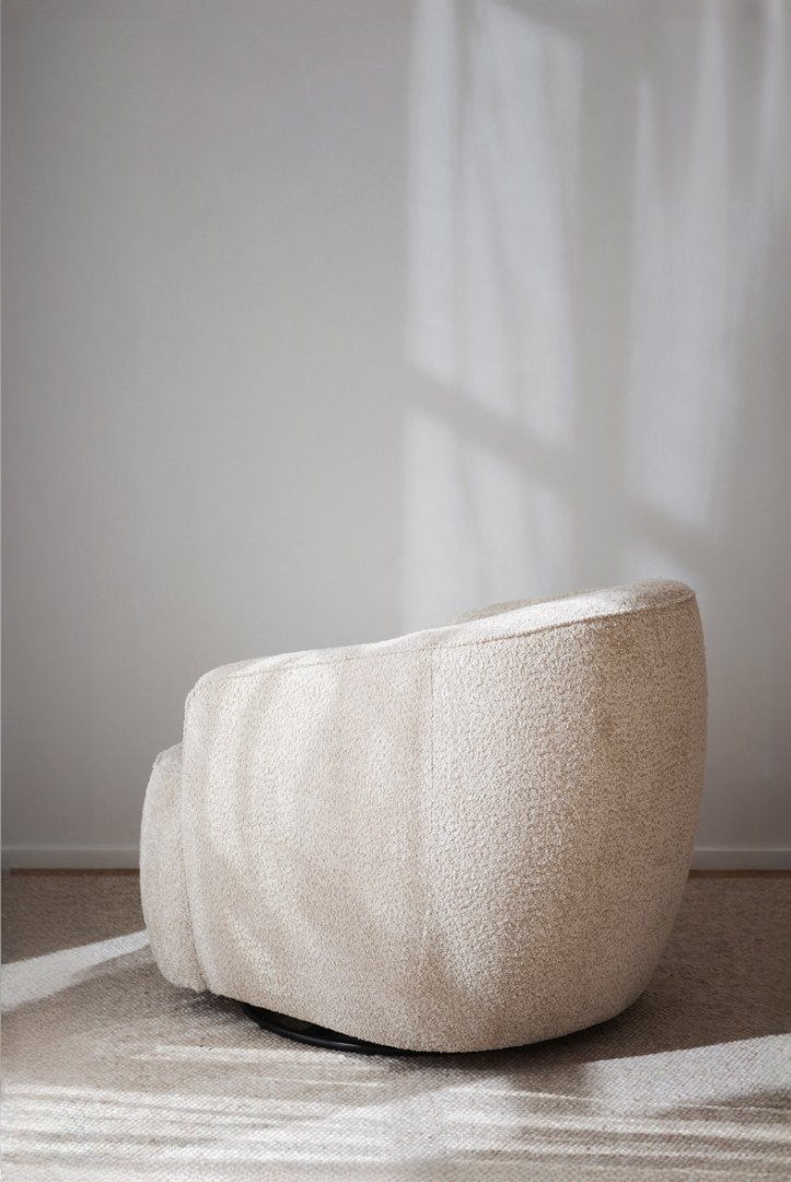 Dermot-nojatuoli on verhoiltu vaaleanbeigellä Anna-kankaalla. Tässä kauniissa lepotuolissa yhdistyvät pehmeät, pyöristetyt muodot sekä tyylikkäät koristetikkaukset. Tuoli tarjoaa erinomaisen istuinmukavuuden ja sen pyörivä mekanismitoiminto tekee siitä täydellisen paikan rentoutumiseen.