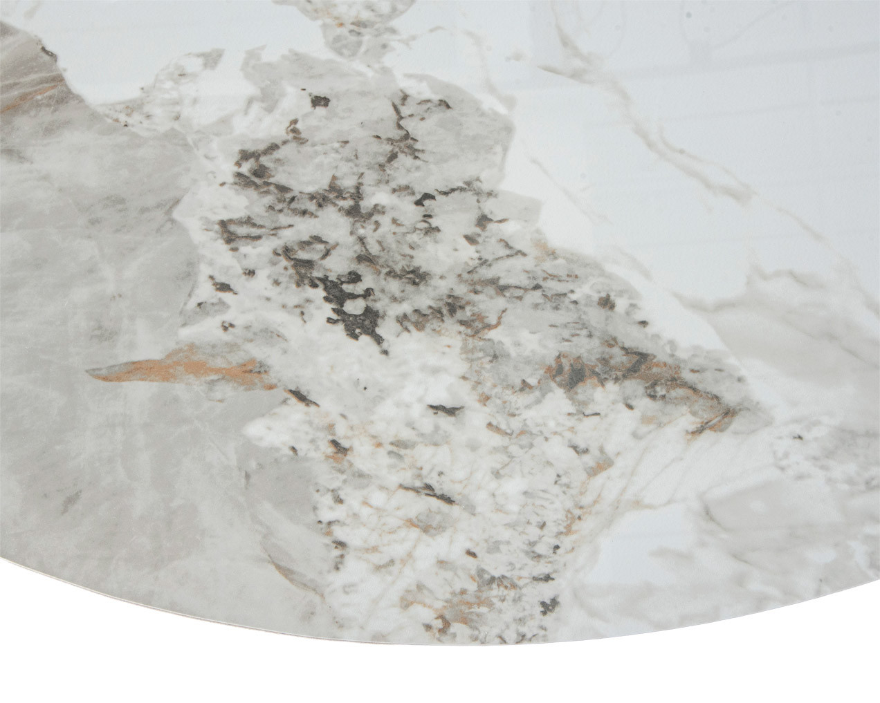 Pöydän vaikuttava 10 mm paksu valkoinen kiiltävä sintrattu kivikansi on paitsi silmiä hivelevä, myös erittäin kestävä ja helppohoitoinen. Sintrattu kivi on materiaalina pitkäikäinen ja kestää hyvin naarmuja sekä lämpöä.