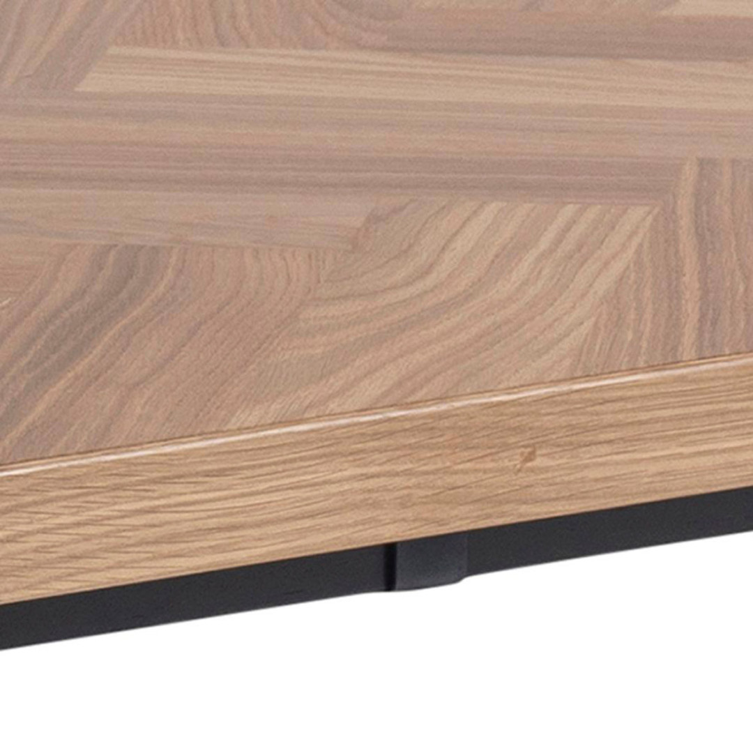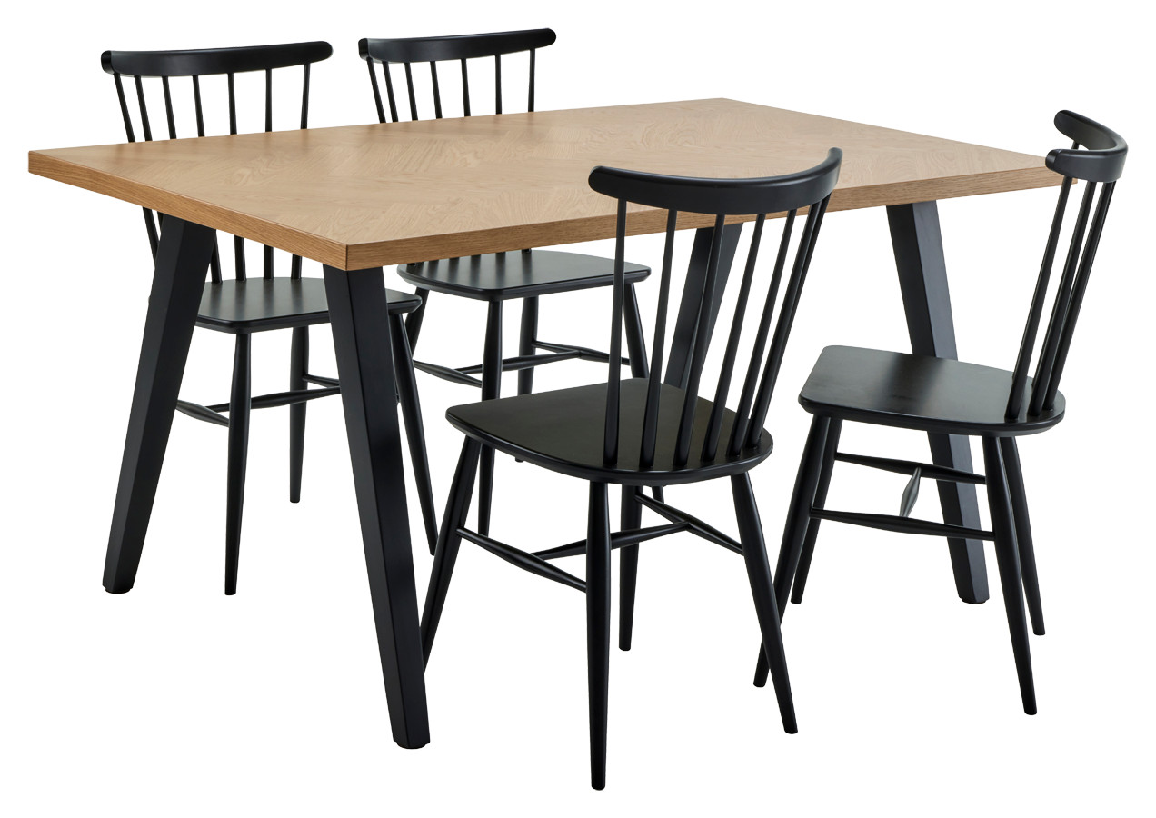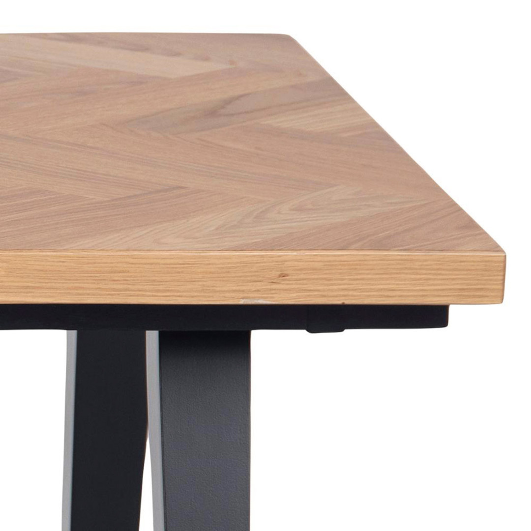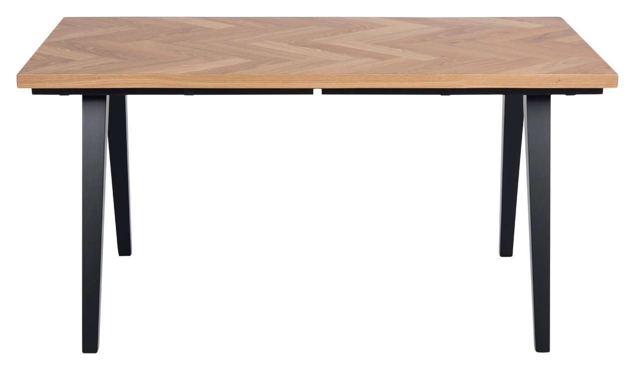 Tyylikkäässä MORGAN-ruokapöydässä on kalanruotokuvioinen taso, joka kiinnittää huomion ja antaa sille hienostuneen ilmeen. Mustat vinot jalat tuovat mukavan kontrastin tammen väriseen kanteen. Tyylikäs pöytä on helppo yhdistää monenlaisiin sisutuksiin, sillä musta ja tammi sopii niin moderniin kuin perinteisempäänkiin kotiin.